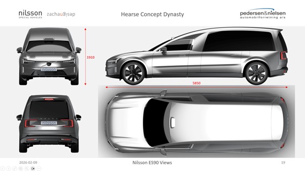 On the Funeral Fair in Vejle on the 3rd of May Zachau Design together with Pedersen & Nielsen Bilforretning presented the Nilsson ES90 Hearse concept. A fully electric hearse based on the Volvo ES 90. So far the concept consists of sketches, 3d CAD and renderings. Now the first prototype is being built by Nilsson Special Vehicles in Laholm to be presented during early summer of 2026.